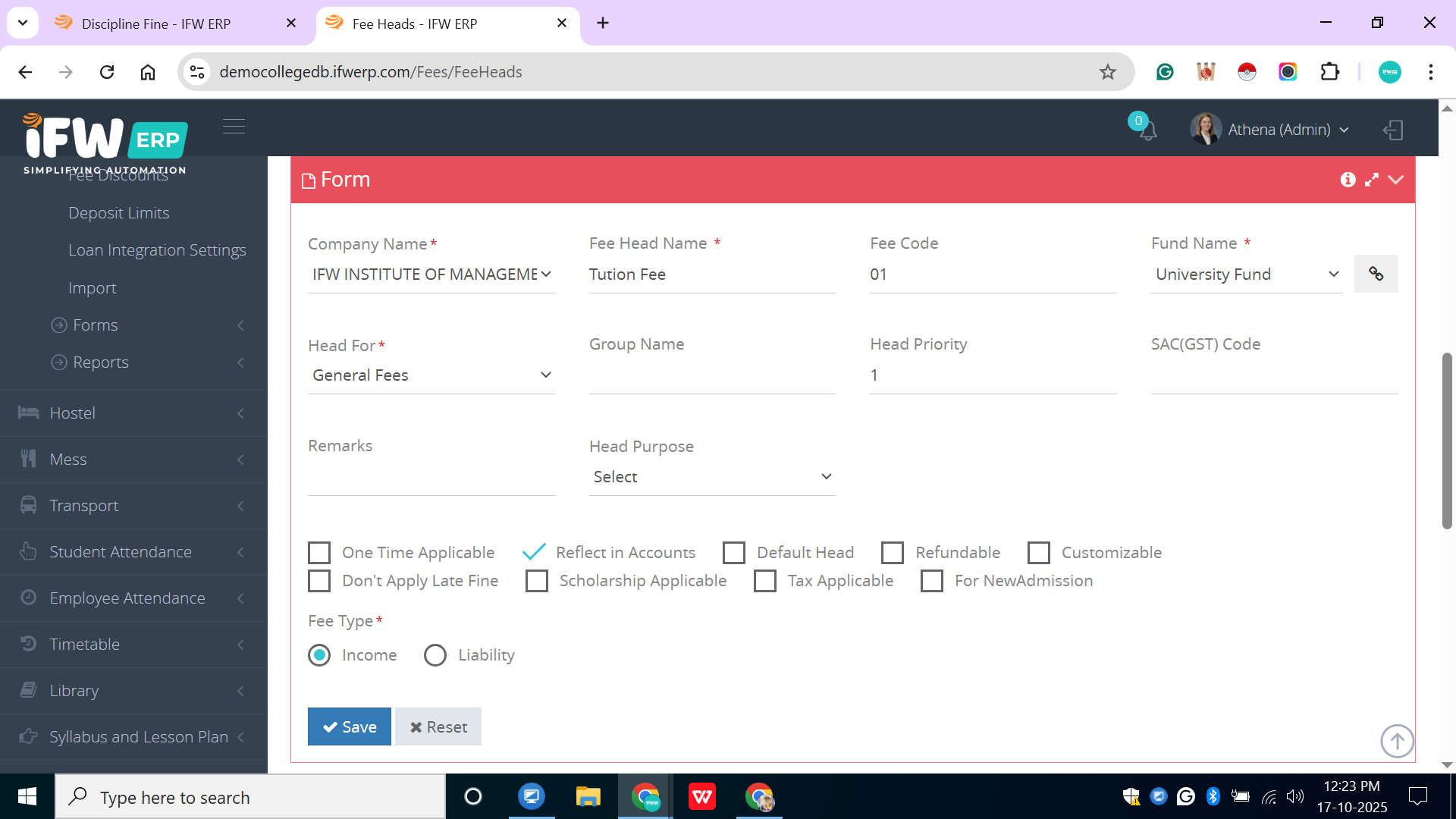 Fee Type - What is the type of head for the institute - Income or Liability? Like caution money head is a liability type because it needs to be transferred back to the student after course completion.