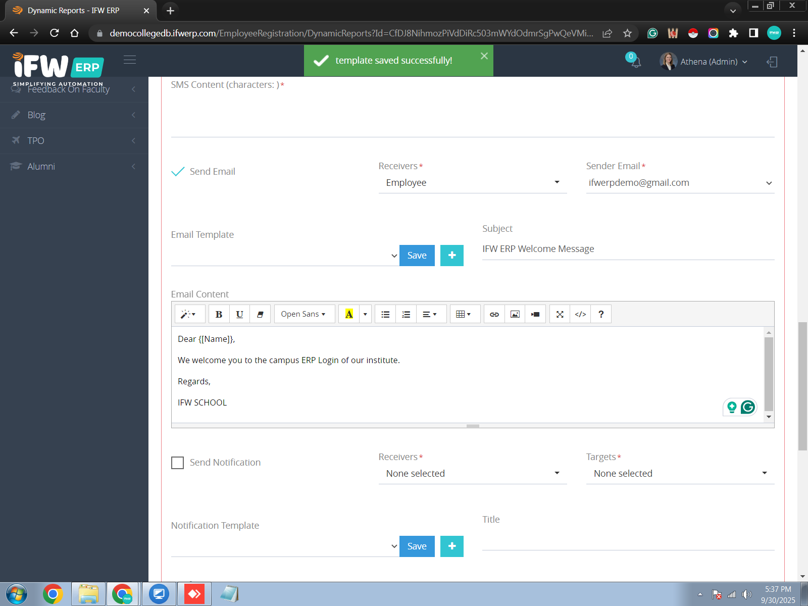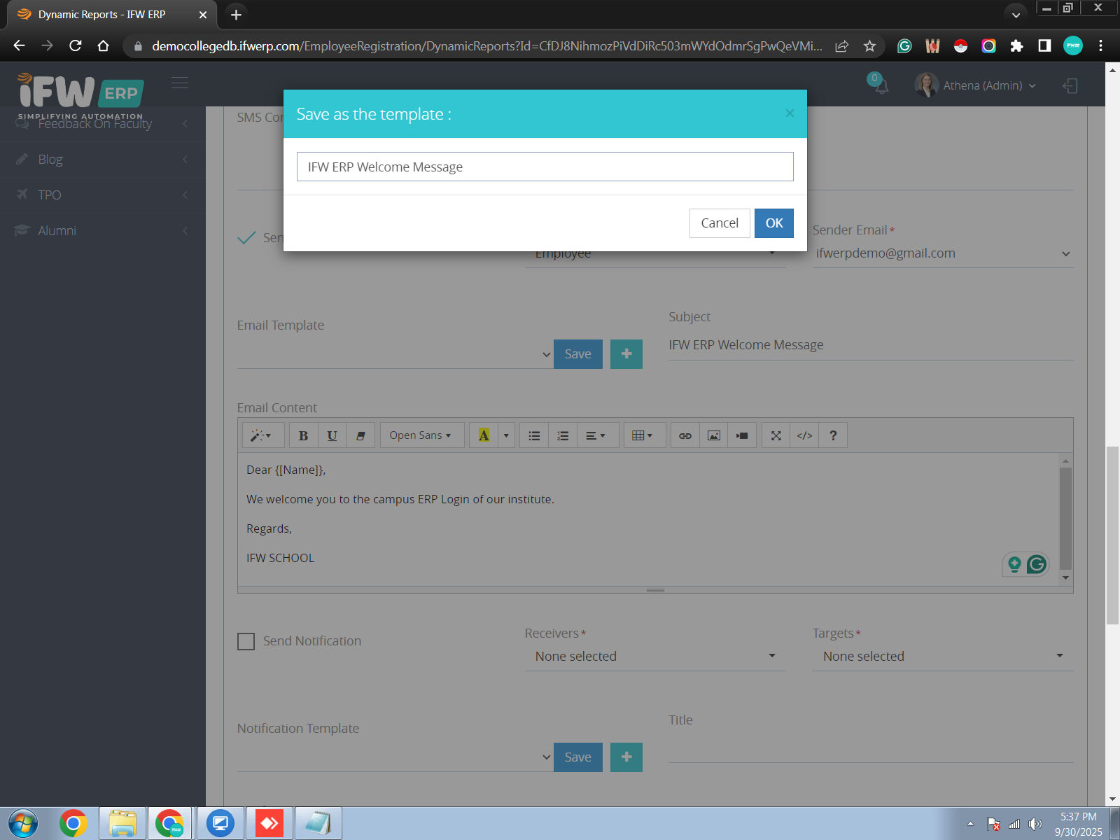 2. Once the template is saved, the user can use the template from the Template selection field.